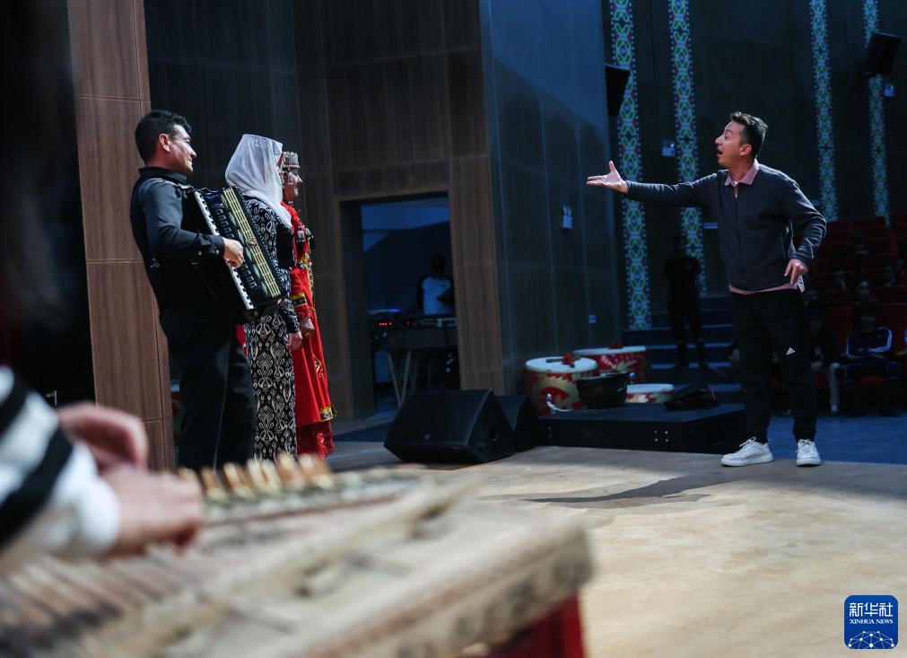 新疆藝術劇院歌舞團再比江·阿地力(右)導演在塔縣文化服務中心劇場指揮演員排練(9月4日攝)。新華社記者 蘭紅光 攝