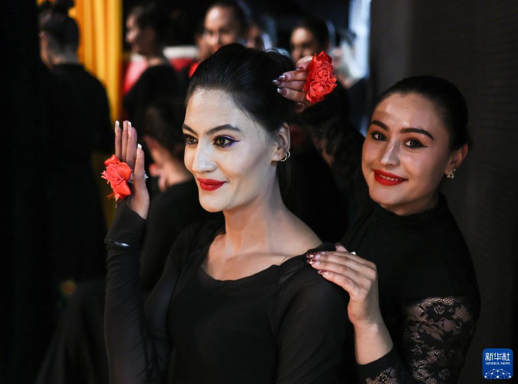 新疆塔縣文工團舞蹈演員布都木·加拿力(前)和同伴在劇場後&等候出場(9月4日攝)。新華社記者 蘭紅光 攝