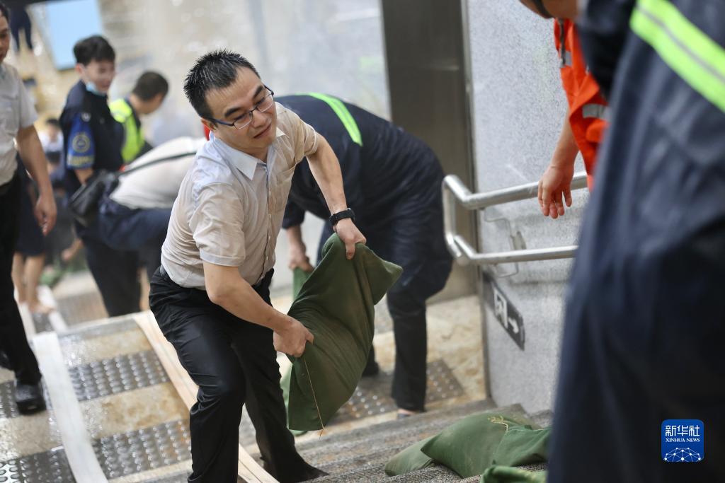 9月7日,在位於深圳市龍崗區的深圳地鐵16號線黃閣坑站,工作人員接力搬運沙袋。