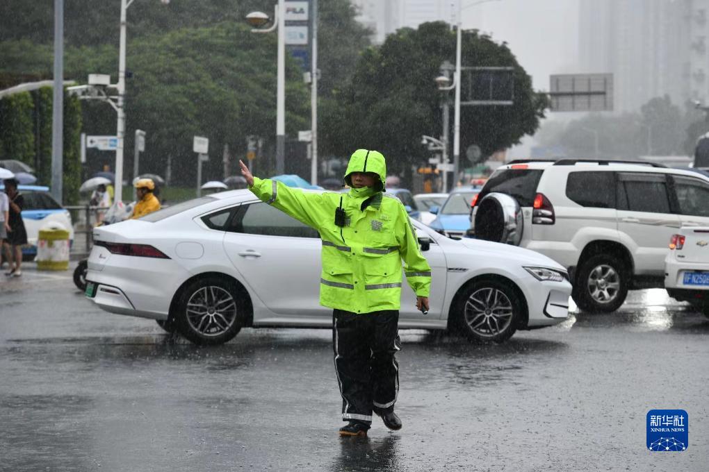 9月8日,深圳交警在暴雨中疏導交通。