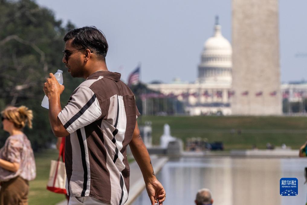 9月7日,在美國首都華盛頓,一名男子喝水抵禦高溫天氣。