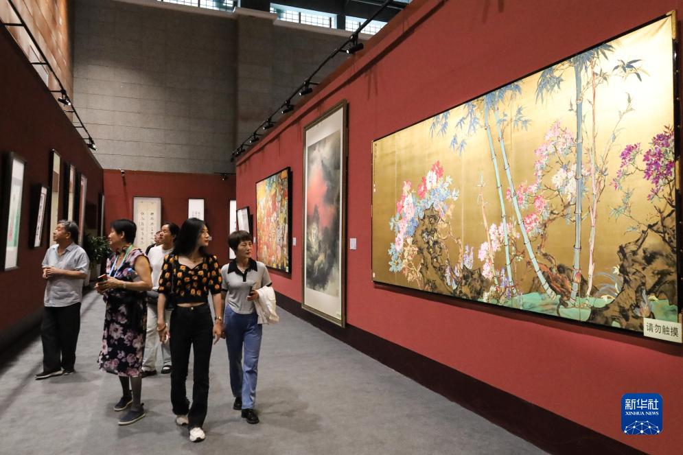 9月7日,觀眾在第六屆絲綢之路(敦煌)國際文化博覽會上參觀絲綢之路繪畫藝術精品展。