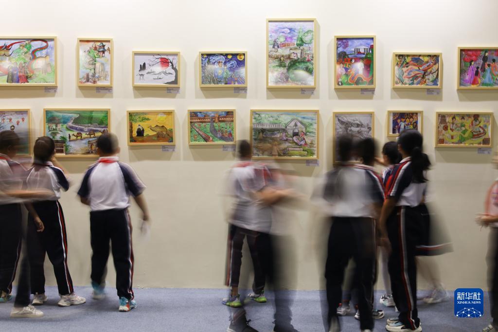 9月7日,學生們在第六屆絲綢之路(敦煌)國際文化博覽會上參觀。