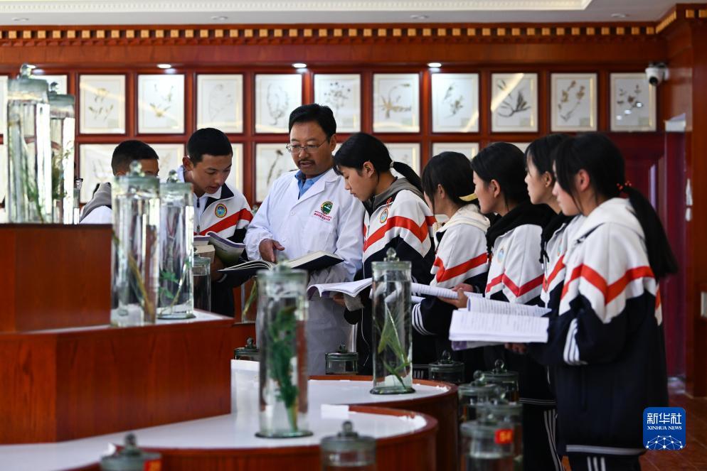 9月8日,在果洛藏族自治州職業技術學校,藏醫醫療與藏藥專業學生在草藥標本館內學習辨認藥材。