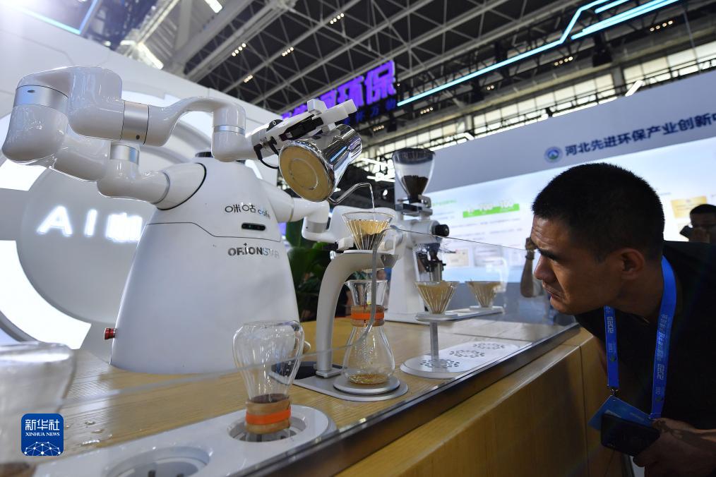 9月6日,參觀者在數博會上觀看AI咖啡手衝機器人製作咖啡。