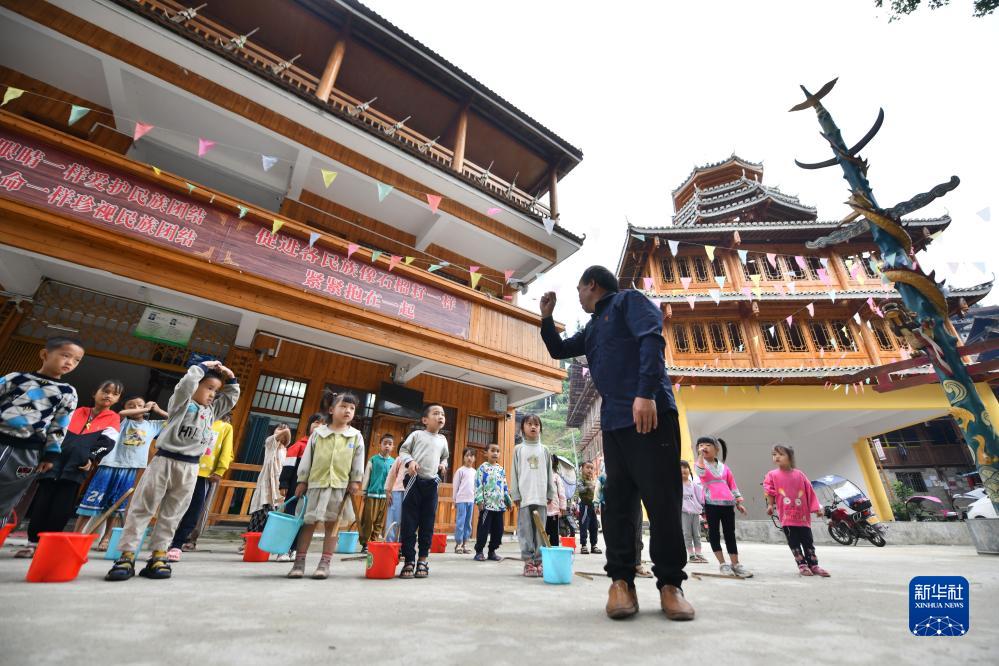 在烏英苗寨教學點,潘先鋒在教新生們學習排隊(2023年9月1日攝)。
