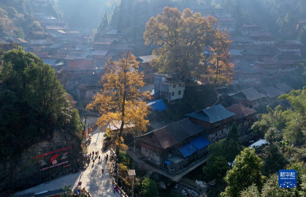 烏英苗寨教學點的孩子們在潘先鋒的帶領下巡寨搞衞生(無人機照片,2022年12月21日攝)。