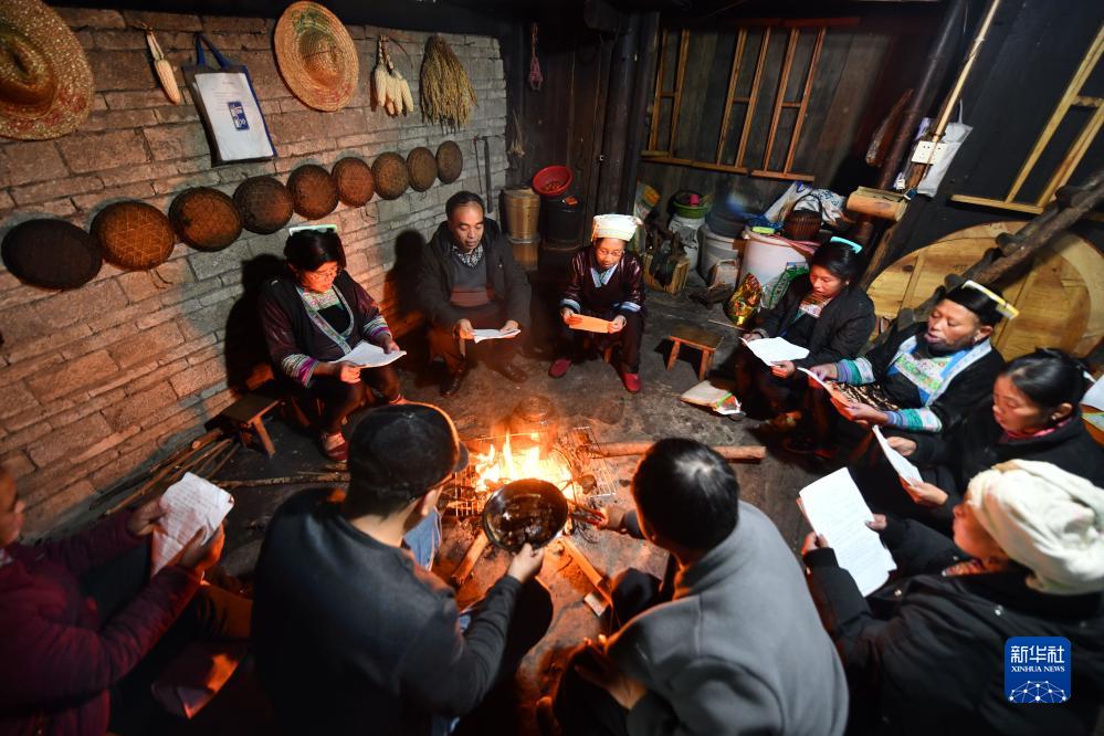 潘先鋒(後排左二)在火塘邊給烏英苗寨夜校的婦女們上課(2021年11月9日攝)。