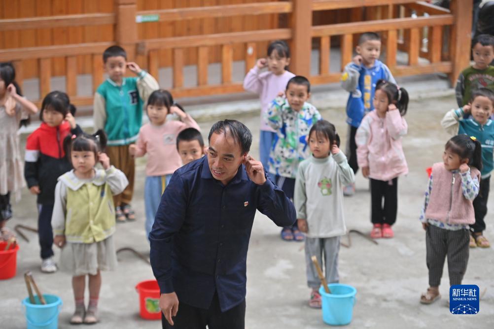 在烏英苗寨教學點,潘先鋒在教新生們學習排隊(2023年9月1日攝)。