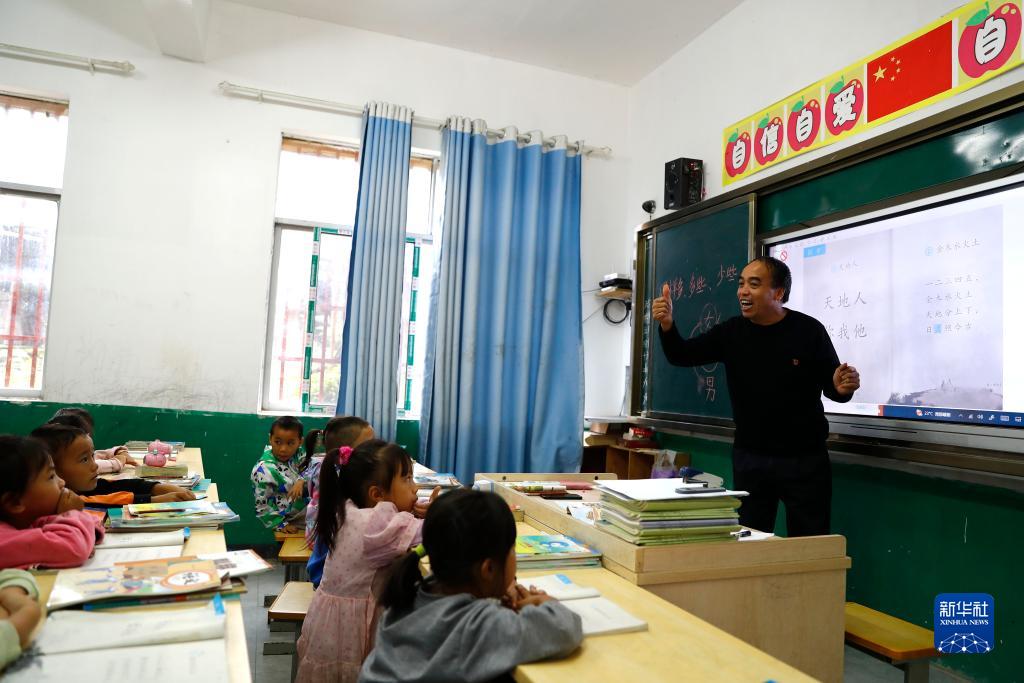 在烏英苗寨教學點,潘先鋒在教室裏上課(2023年8月30日攝)。