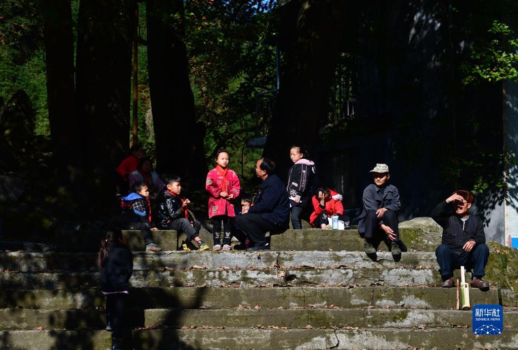 在烏英苗寨教學點,潘先鋒(右五)在古樹下與孩子們交流(2021年11月25日攝)。