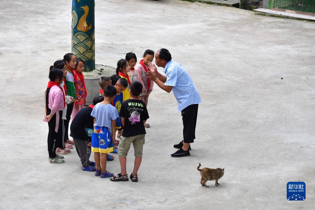 在烏英苗寨教學點,潘先鋒在鼓勵學生(2022年6月9日攝)。