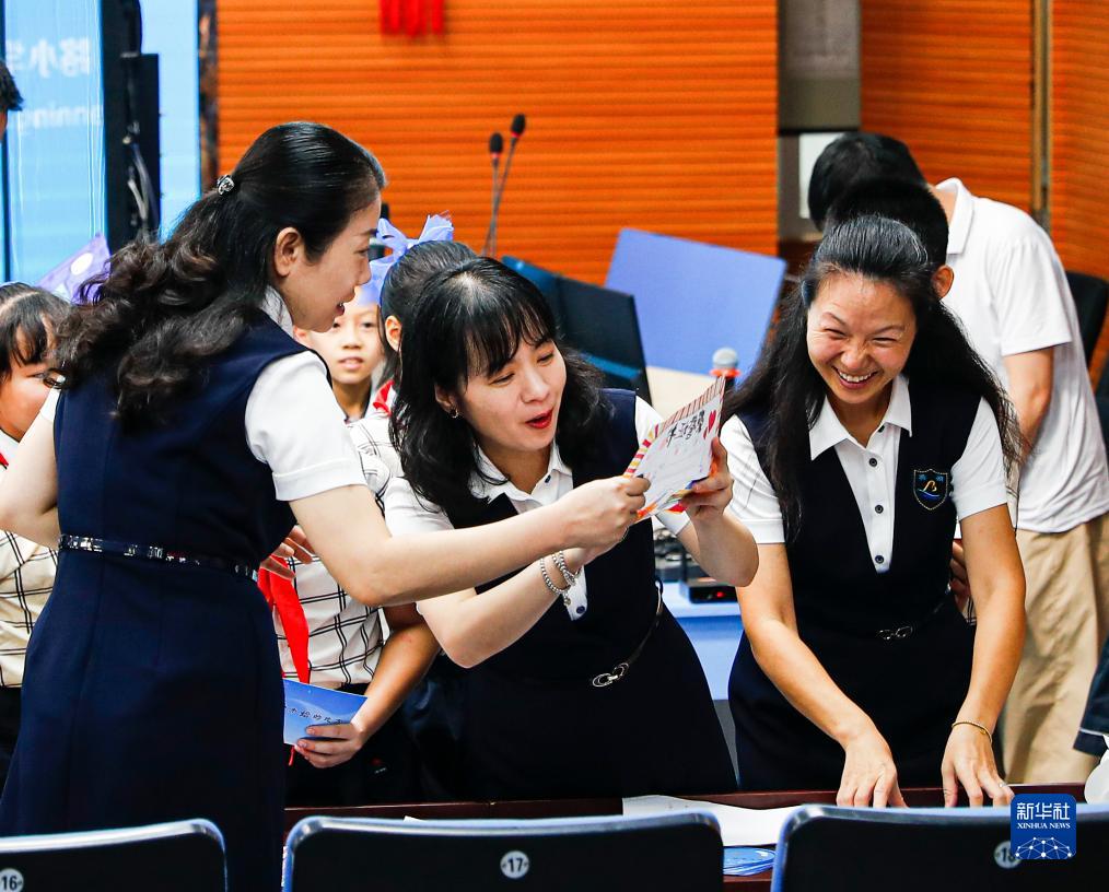 9月8日,南寧市濱湖路小學的教師翻看學生們送上的手繪獎狀。