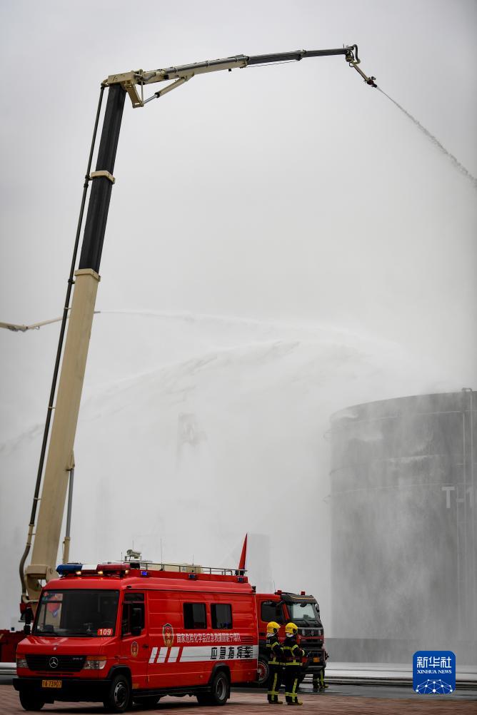 9月8日,在實戰滅火演練現場,大跨度高噴消防車對甲醇儲罐進行冷卻滅火。
