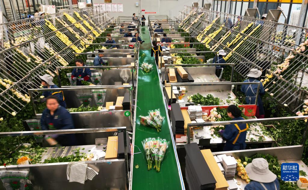 9月7日,在臨夏市枹罕鎮的一處花卉特色産業示範園區,工人在玫瑰分揀包裝生産線上忙碌。