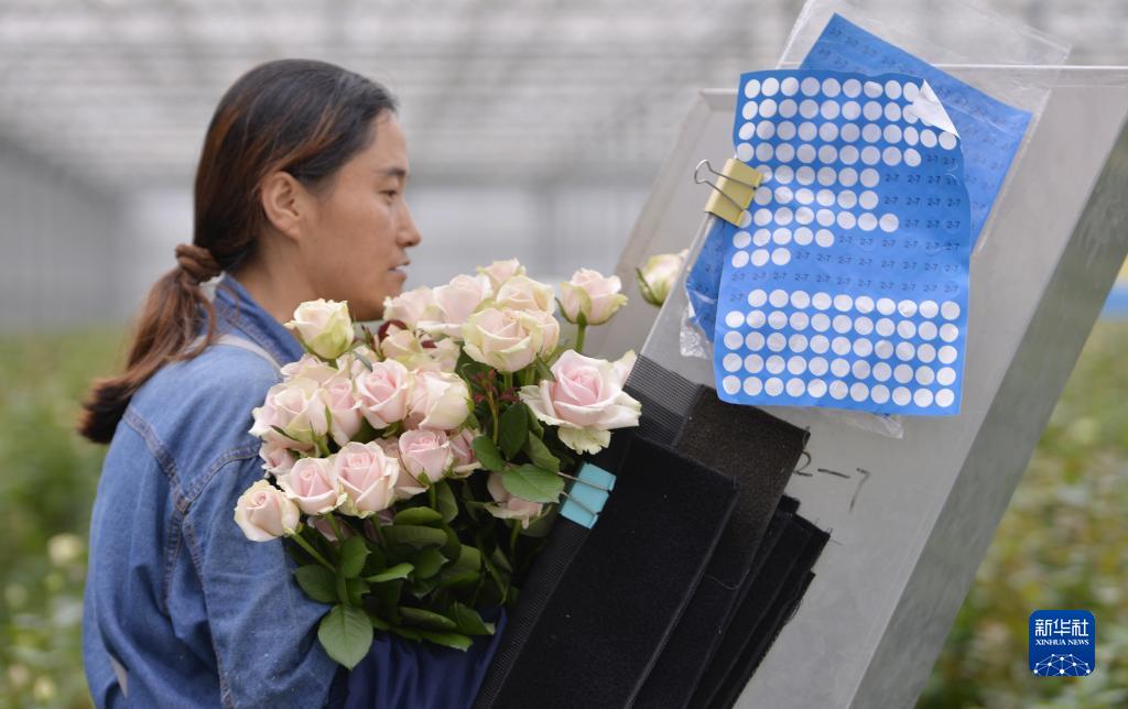 9月7日,在臨夏市枹罕鎮的一處花卉特色産業示範園區智能溫室,工人把採摘的玫瑰打包。