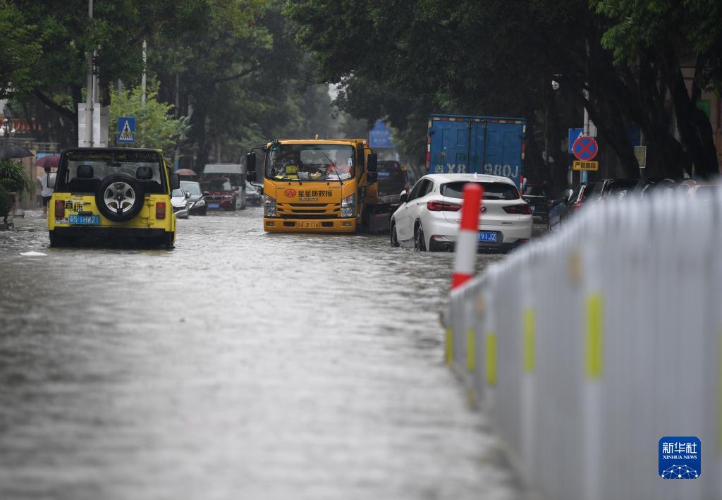 9月8日,在廣州市番禺區繁華路,參與救援的拖車在積水中行進。