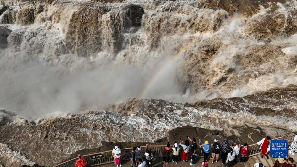 9月8日,游客在黃河壺口瀑布景區游覽(無人機照片)。