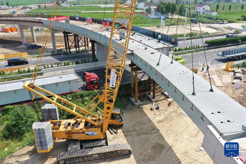 9月8日在江蘇省東&市拍攝的東興高速上跨G15沈海高速架梁作業現場(無人機照片)。