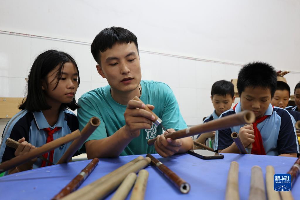 在江西省吉安市泰和縣水槎鄉中心小學,肖惠文教孩子們給竹笛打孔(9月5日攝)。