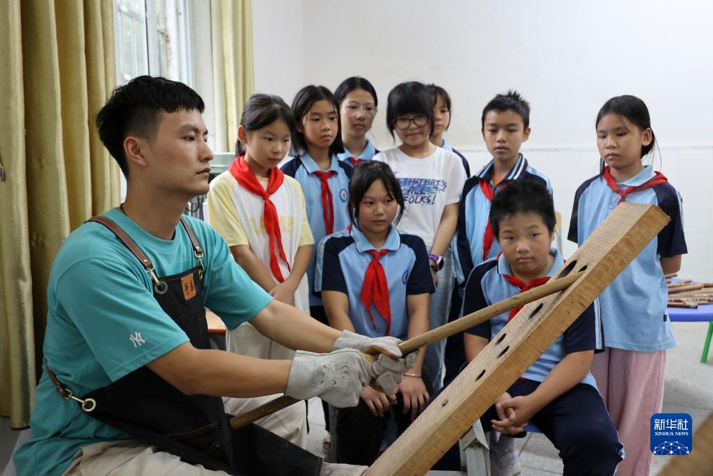 在江西省吉安市泰和縣水槎鄉中心小學,肖惠文教孩子們製作竹笛(9月5日攝)。