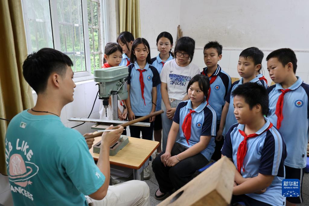 在江西省吉安市泰和縣水槎鄉中心小學,肖惠文教孩子們製作竹笛(9月5日攝)。