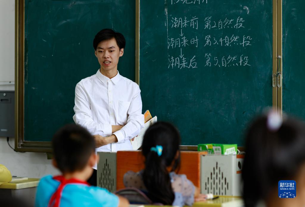 9月7日,在通道縣獨坡鎮上岩村小學,今年剛畢業的“定向師範生”潘遠恒老師在上語文課。