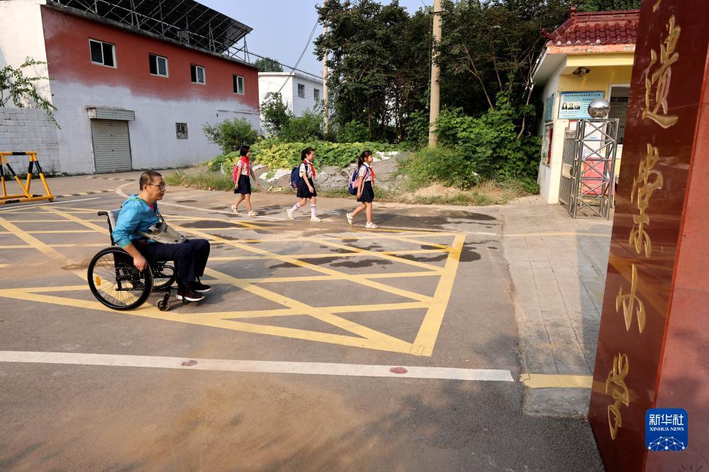 9月4日,在山東省棗莊市永安鎮遺棠小學門口,楊季剛劃着輪椅進入校園。