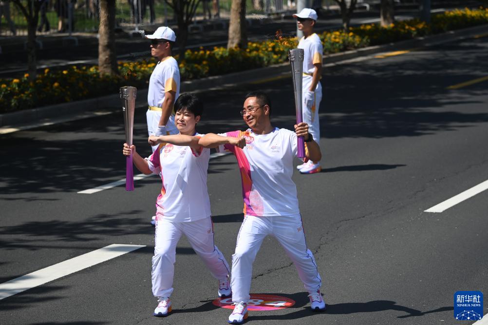 9月9日,火炬手周春龍(右)和劉婷婷在火炬傳遞中。