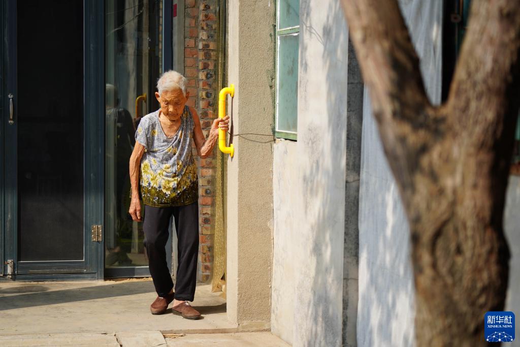 9月8日,河北省巨鹿縣後辛莊村95歲的蘆遂扶着適老化改造工程安裝的扶手在院子裏行走。
