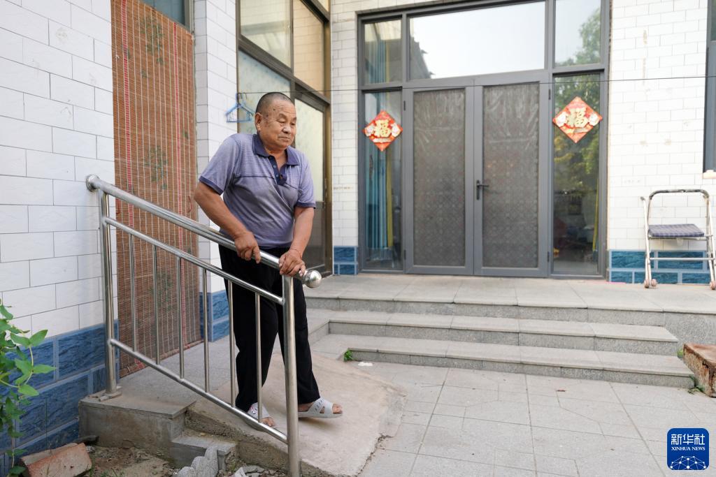 9月8日,河北省巨鹿縣白寨村78歲的張廷軍扶着適老化改造工程安裝的扶手走出屋門。