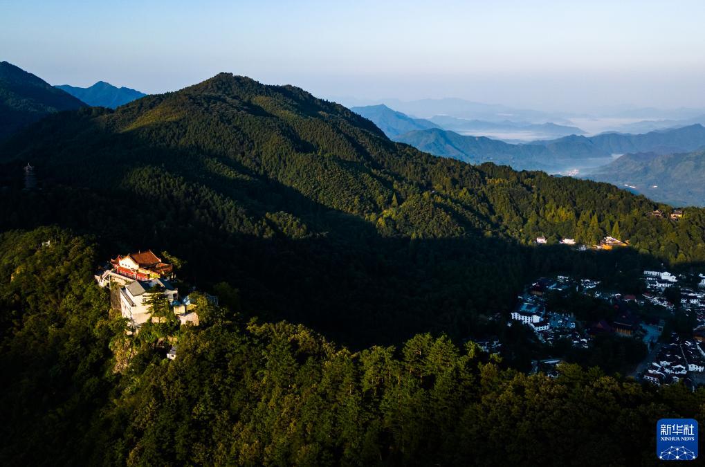 9月9日拍攝的九華山清晨日出時分景色(無人機照片)。
