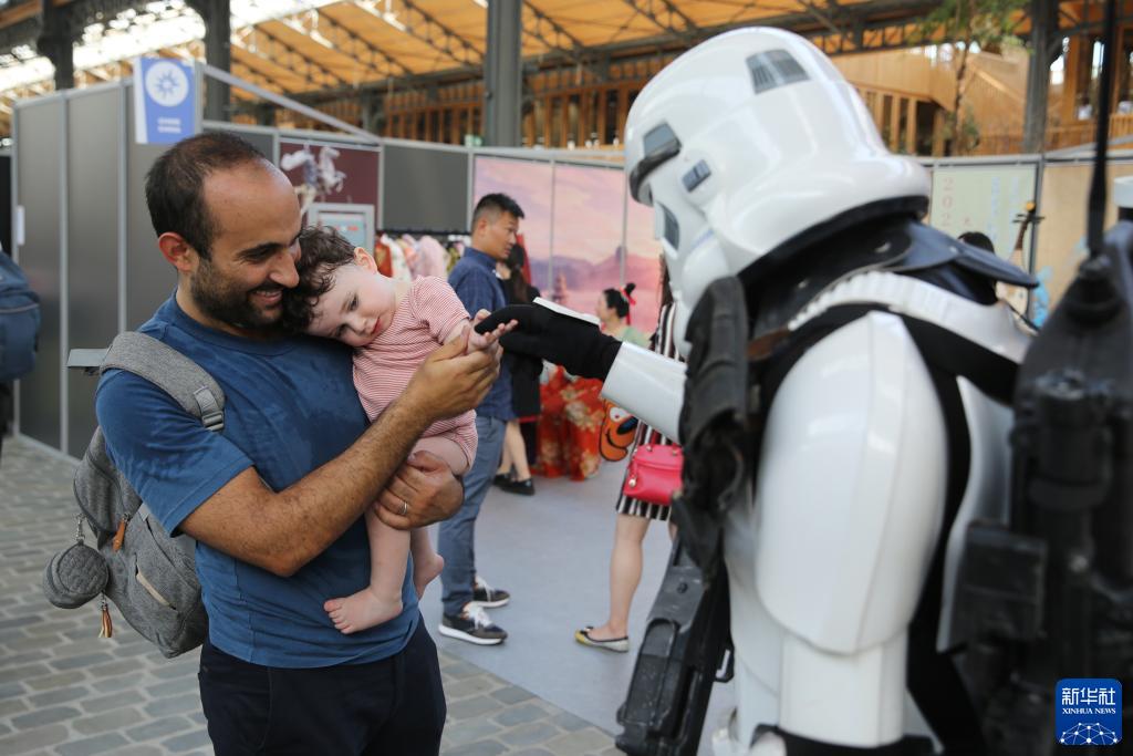 9月8日,在比利時布魯塞爾,扮成《星球大戰》系列作品人物形象的工作人員與小朋友互動。