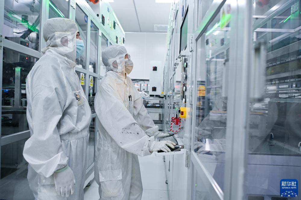 工作人員在蜂巢能源科技(鹽城)有限公司生産車間內操作智能生産設備(9月8日攝)。