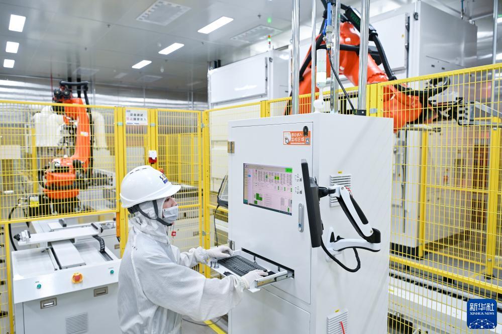 工作人員在蜂巢能源科技(鹽城)有限公司生産車間內操作智能生産設備(9月8日攝)。