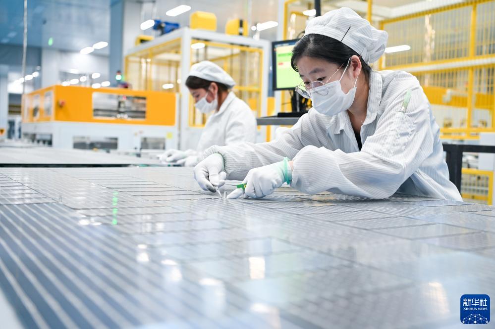 工人在江蘇省鹽城市建湖縣悅陽光伏科技有限公司生産車間內作業(9月6日攝)。
