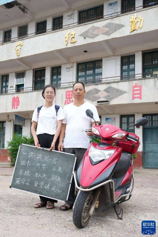 9月7日,陳艷輝(左)和父親陳二文拿着上門送教時使用的小黑板在湖南省株洲市界首中心小學白洲教學點留影。