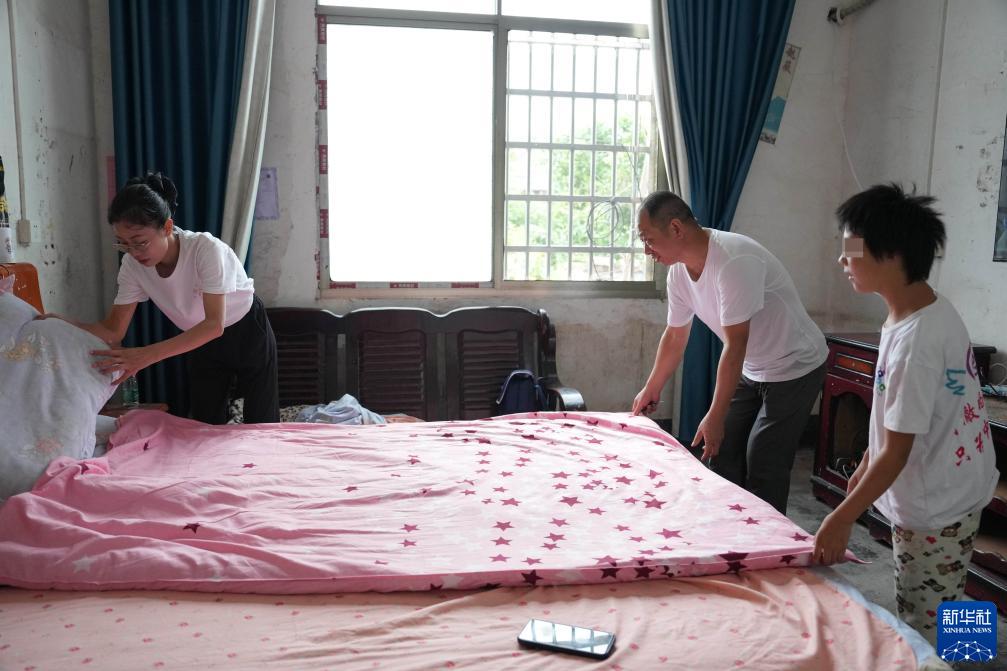9月7日,陳艷輝(左)和陳二文(中)在湖南省株洲市茶陵縣界首鎮大新村的小美家中帶小美做家務。小美先天智力障礙,陳艷輝和陳二文教她生活常識,小美基本學會了掃地、洗衣、做飯。新華社記者 薛宇舸 攝