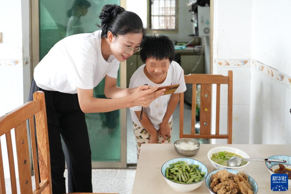 9月7日,陳艷輝(左)在湖南省株洲市茶陵縣界首鎮大新村的小美家中和小美一起拍下做好的午飯。新華社記者 薛宇舸 攝