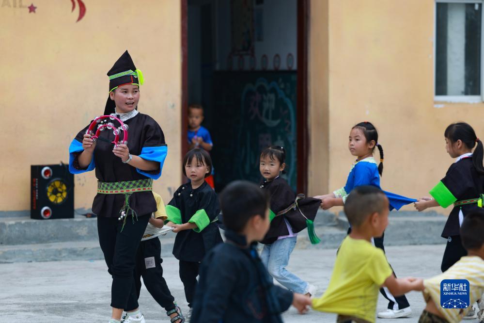 柳吉小學教師王章艷帶領學生在課間玩游戲(9月7日攝)。