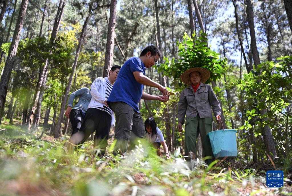 9月6日,曾念開(中)在指導海南省保亭黎族苗族自治縣毛感鄉的農民種植靈芝。
