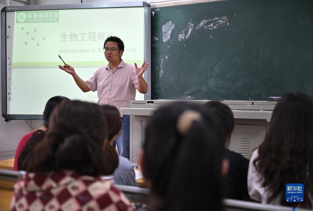 9月7日,曾念開(右)在海南師範大學給學生上課。