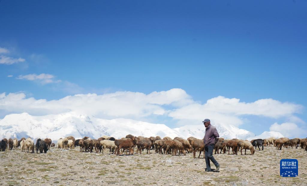 在“冰川之父”慕士塔格峰腳下,新疆塔什庫爾幹塔吉克自治縣塔合曼鄉境內的一片天然草場吸引周邊鄉村的牧羊人在此放牧。進入秋季以來,草場漸漸泛黃,屹立於遠處的慕士塔格峰和公格爾九別峰在藍天白雲的映襯下格外壯美,一幅寧靜悠遠的牧羊圖引人入勝。