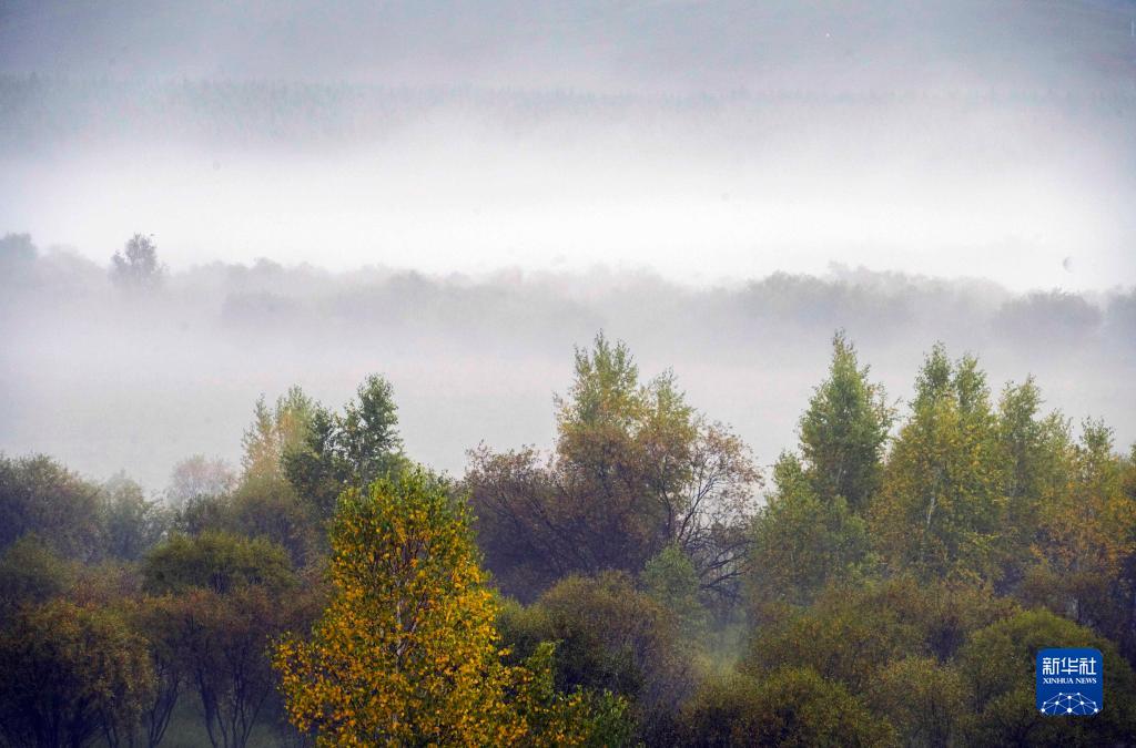 當日,位於河北省承德市的賽罕壩國家森林公園霧氣繚繞,秋景迷人。