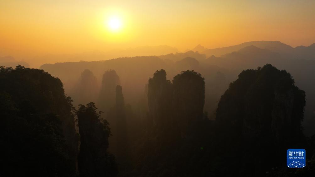 當日清晨,在湖南張家界國家森林公園黃石寨,朝陽的光芒將峰林渲染,繪就出一幅唯美夢幻的自然畫卷。