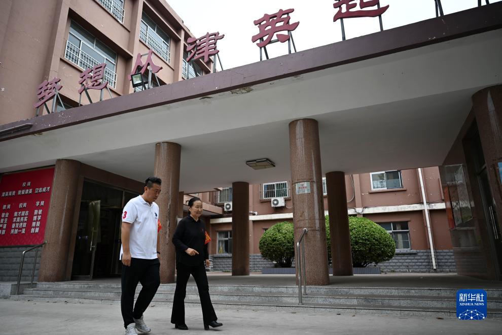 張慧穎(右)和同事走在津英中學校園裏(9月8日攝)。