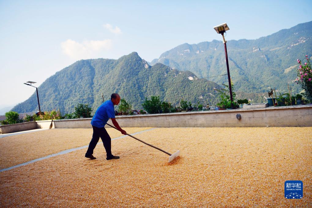 初秋時節,湖北省宜昌市秭歸縣九畹溪鎮的村民將收穫的玉米、辣椒等農産品晾曬在房前屋後,勾勒出一幅幅山村“曬秋”圖。