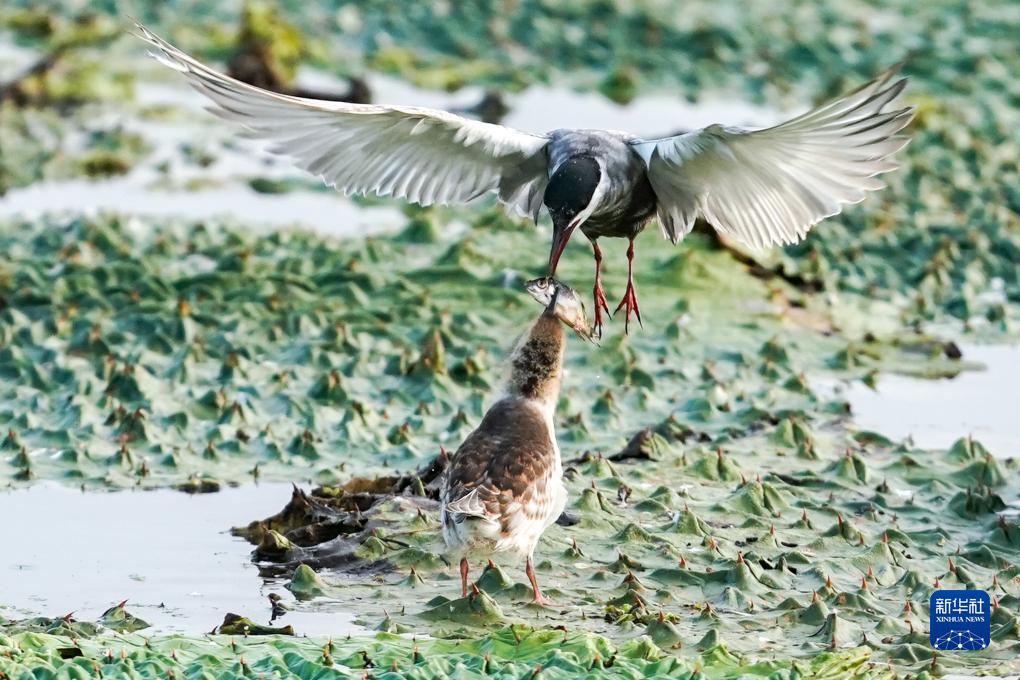 在江蘇省鹽城市建湖縣九龍口國家濕地公園內,須浮鷗銜着小魚給幼鳥喂食(9月7日攝)。