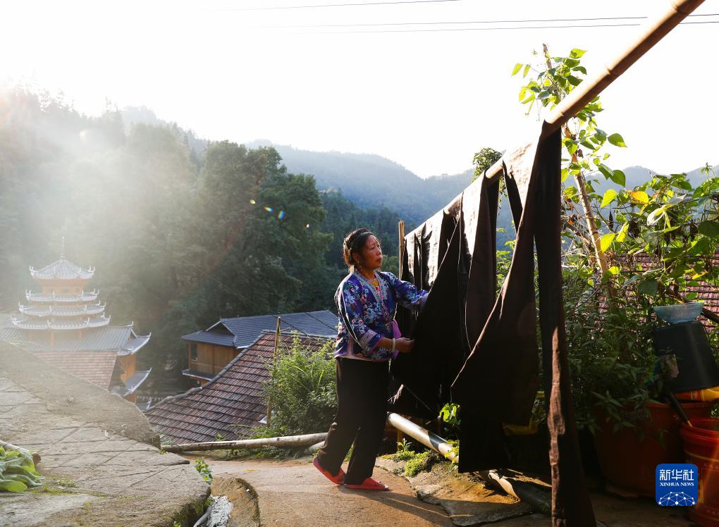 烏英苗寨婦女梁足英在晾曬還未完工的亮布(8月30日攝)。