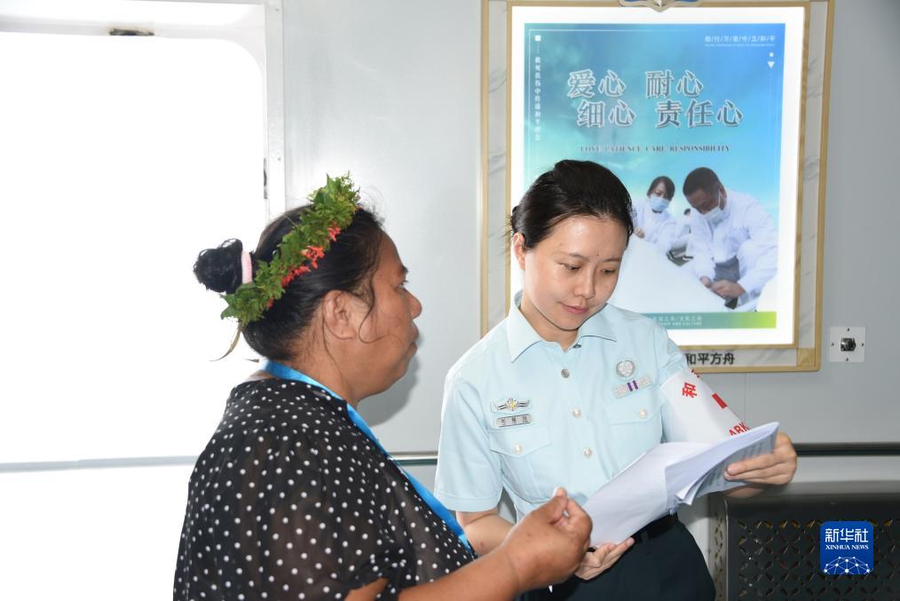 中國海軍“和平方舟”號醫院船在基裏巴斯開展醫療服務期間,一名文職醫生為患者解讀化驗報告(7月15日攝)。